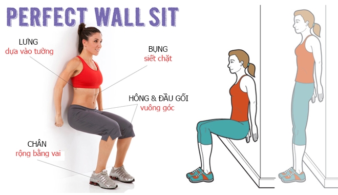 Cách thực hiện: Đứng tựa lưng vào tường, 2 chân mở rộng bằng vai tạo với thân người một góc 45 độ. 2 tay chống lên hông, từ từ hạ gối vuông góc với mặt sàn, dồn trọng lượng cơ thể xuống 2 bàn chân. Hít thở đều, giữ khoảng 10 giây và lặp lại 4-5 lần.